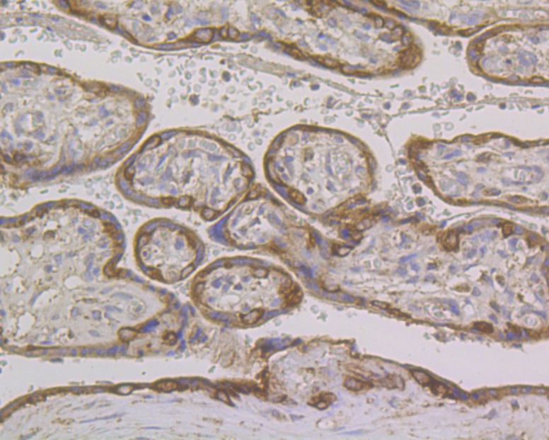 Immunohistochemical analysis of paraffin-embedded human placenta tissue using anti-Cytokeratin 7 antibody. The section was pre-treated using heat mediated antigen retrieval with Tris-EDTA buffer (pH 8.0-8.4) for 20 minutes.The tissues were blocked in 5% BSA for 30 minutes at room temperature, washed with ddH2O and PBS, and then probed with the antibody (ER1803-89) at 1/200 dilution, for 30 minutes at room temperature and detected using an HRP conjugated compact polymer system. DAB was used as the chromogen. Counter stained with hematoxylin and mounted with DPX.