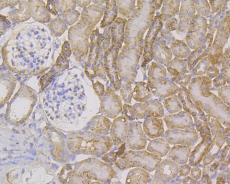 Immunohistochemical analysis of paraffin-embedded mouse kidney tissue using anti-Cytokeratin 7 antibody. The section was pre-treated using heat mediated antigen retrieval with Tris-EDTA buffer (pH 8.0-8.4) for 20 minutes.The tissues were blocked in 5% BSA for 30 minutes at room temperature, washed with ddH2O and PBS, and then probed with the antibody (ER1803-89) at 1/200 dilution, for 30 minutes at room temperature and detected using an HRP conjugated compact polymer system. DAB was used as the chromogen. Counter stained with hematoxylin and mounted with DPX.