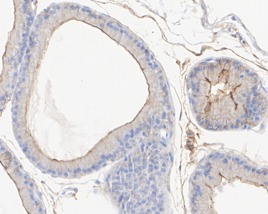 Immunohistochemical analysis of paraffin-embedded rat prostate tissue with Rabbit anti-MMP-14 antibody (ET1606-48) at 1/10,000 dilution.