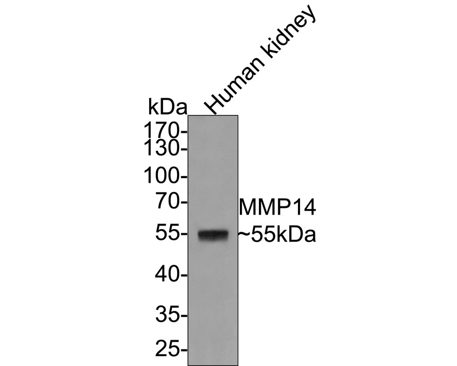 Western blot analysis of MMP-14 on human kidney tissue lysates with Rabbit anti-MMP-14 antibody (ET1606-48) at 1/1,000 dilution.