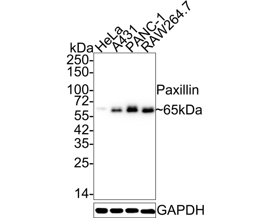 Western blot analysis of Paxillin on different lysates with Rabbit anti-Paxillin antibody (ET1607-22) at 1/5,000 dilution.