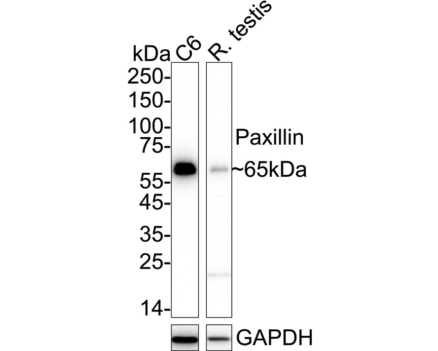 Western blot analysis of Paxillin on different lysates with Rabbit anti-Paxillin antibody (ET1607-22) at 1/1,000 dilution.