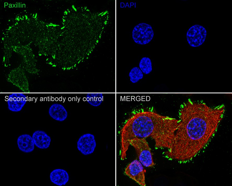 Cells were fixed in 4% paraformaldehyde for 20 minutes at room temperature, permeabilized with 0.1% Triton X-100 in PBS for 5 minutes at room temperature, then blocked with 1% BSA in 10% negative goat serum for 1 hour at room temperature. Cells were then incubated with Rabbit anti-Paxillin antibody (ET1607-22) at 1/50 dilution in 1% BSA in PBST overnight at 4 ℃. Goat Anti-Rabbit IgG H&L (iFluor™ 488, HA1121) was used as the secondary antibody at 1/1,000 dilution. PBS instead of the primary antibody was used as the secondary antibody only control. Nuclear DNA was labelled in blue with DAPI.