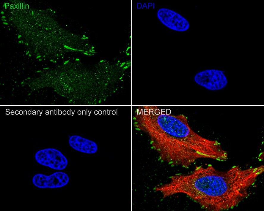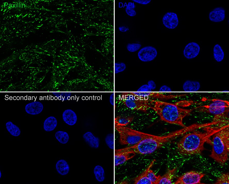 Cells were fixed in 4% paraformaldehyde for 15 minutes at room temperature, permeabilized with 0.1% Triton X-100 in PBS for 15 minutes at room temperature, then blocked with 1% BSA in 10% negative goat serum for 1 hour at room temperature. Cells were then incubated with Rabbit anti-Paxillin antibody (ET1607-22) at 1/100 dilution in 1% BSA in PBST overnight at 4 ℃. Goat Anti-Rabbit IgG H&L (iFluor™ 488, HA1121) was used as the secondary antibody at 1/1,000 dilution. PBS instead of the primary antibody was used as the secondary antibody only control. Nuclear DNA was labelled in blue with DAPI.