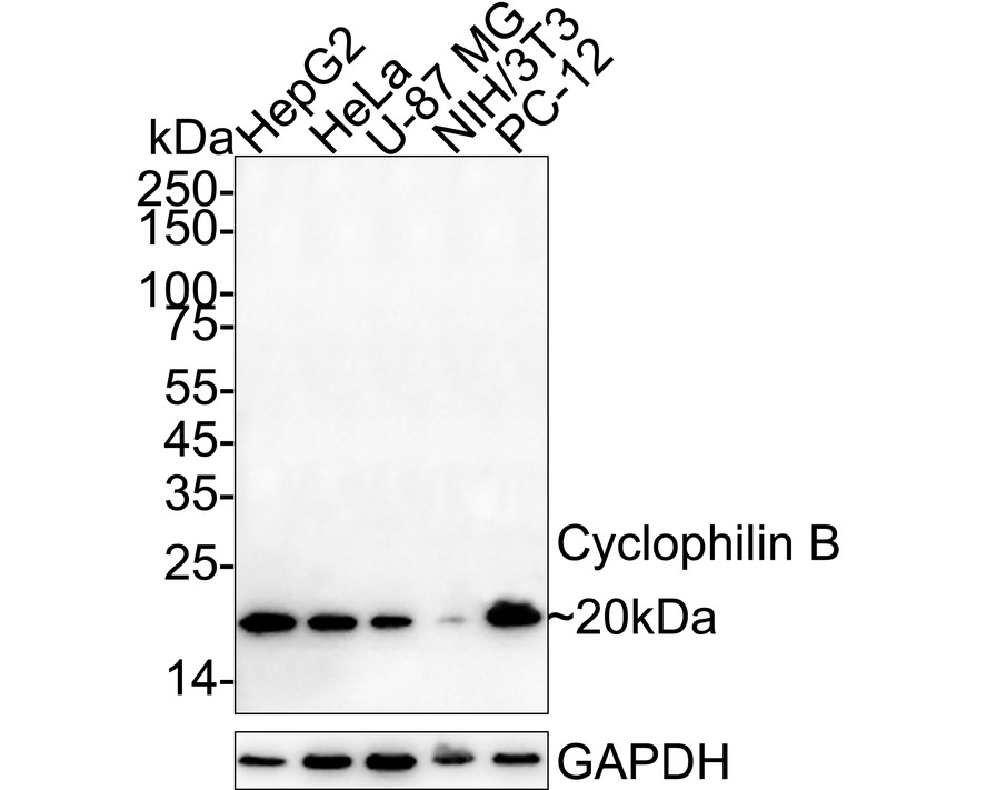 Western blot analysis of Cyclophilin B on different lysates with Rabbit anti-Cyclophilin B antibody (ET1609-58) at 1/1,000 dilution.