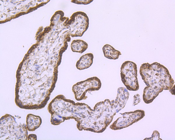 Immunohistochemical analysis of paraffin-embedded human placenta tissue using anti-Cyclophilin B antibody. The section was pre-treated using heat mediated antigen retrieval with Tris-EDTA buffer (pH 8.0-8.4) for 20 minutes.The tissues were blocked in 5% BSA for 30 minutes at room temperature, washed with ddH2O and PBS, and then probed with the primary antibody (ET1609-58, 1/200) for 30 minutes at room temperature. The detection was performed using an HRP conjugated compact polymer system. DAB was used as the chromogen. Tissues were counterstained with hematoxylin and mounted with DPX.