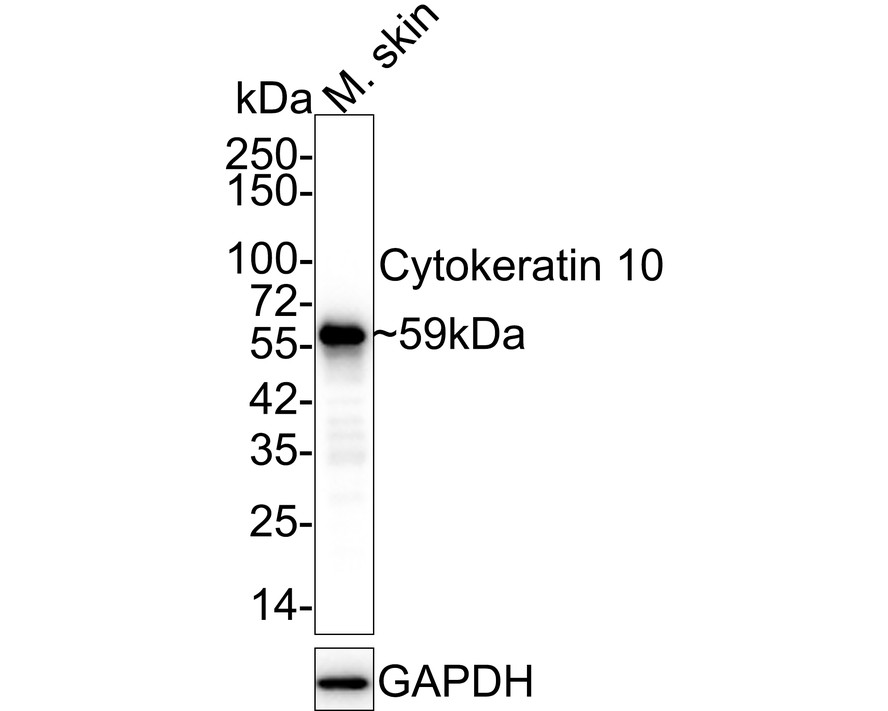 Western blot analysis of Cytokeratin 10 on mouse skin tissue lysates with Rabbit anti-Cytokeratin 10 antibody (ET1609-75) at 1/2,000 dilution.
