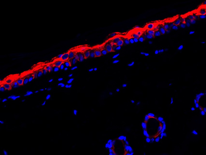 The section was pre-treated using heat mediated antigen retrieval with Tris-EDTA buffer (pH 9.0) for 20 minutes. The tissues were blocked in 10% negative goat serum for 1 hour at room temperature, washed with PBS. And then probed with the primary antibodies Cytokeratin 10 (ET1609-75, red) at 1/500 dilution at +4℃ overnight, washed with PBS.