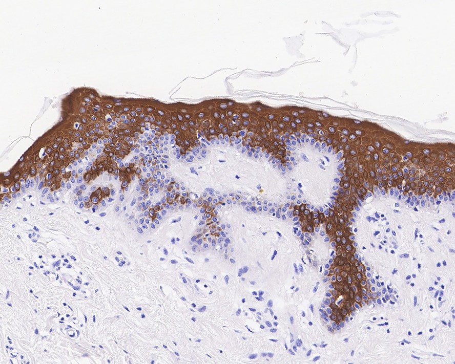 Immunohistochemical analysis of paraffin-embedded human skin tissue with Rabbit anti-Cytokeratin 10 antibody (ET1609-75) at 1/1,500 dilution.