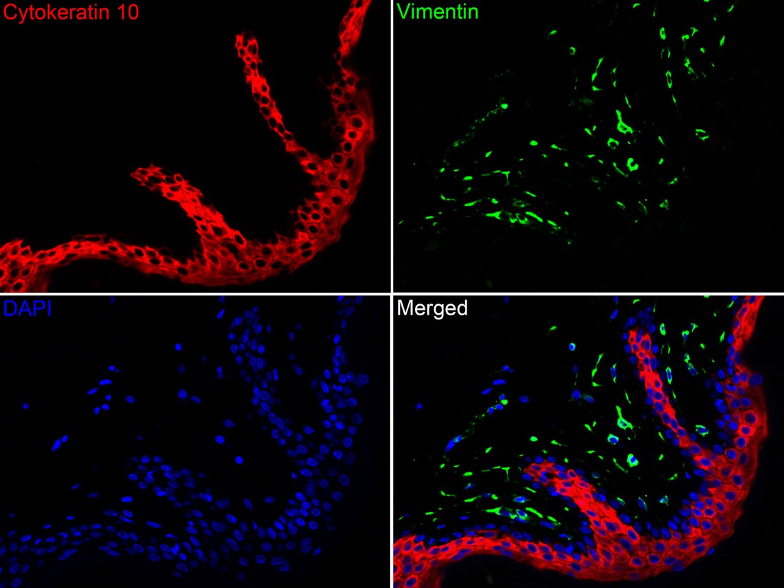 Immunofluorescence analysis of paraffin-embedded human skin tissue labeling Cytokeratin 10 (ET1609-75) and Vimentin (EM0401).