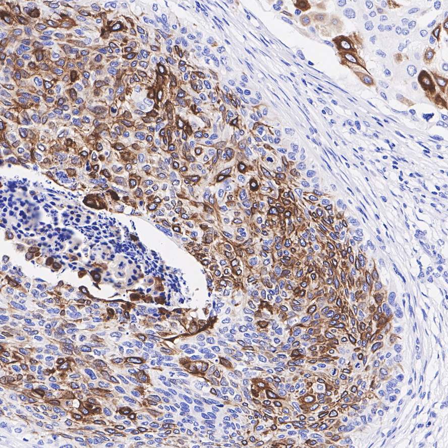 Immunohistochemical analysis of paraffin-embedded human cervical cancer tissue with Rabbit anti-Cytokeratin 10 antibody (ET1609-75) at 1/1,000 dilution.