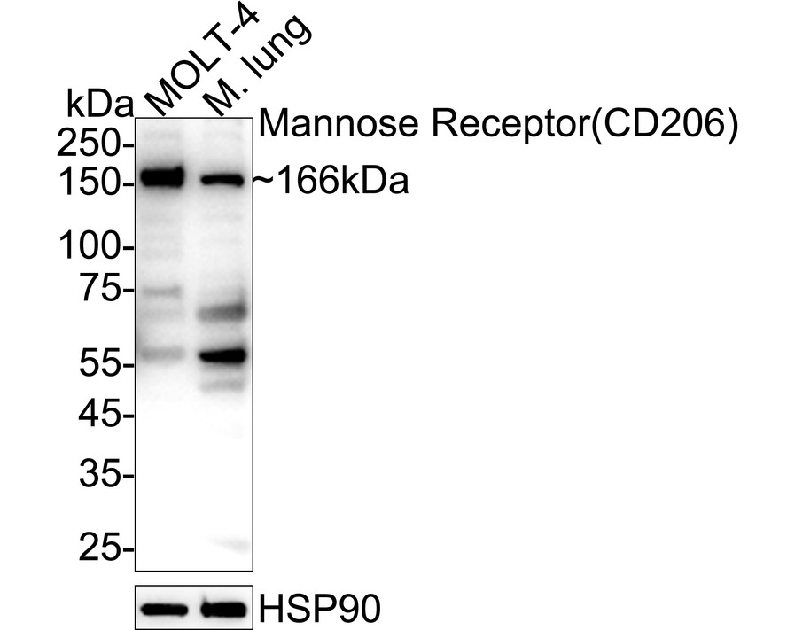 Western blot analysis of Mannose Receptor(CD206) on different lysates. Proteins were transferred to a PVDF membrane and blocked with 5% BSA in PBS for 1 hour at room temperature. The primary antibody (ET1702-04, 1/1,000) was used in 5% BSA at room temperature for 2 hours. Goat Anti-Rabbit IgG - HRP Secondary Antibody (HA1001) at 1/50,000 dilution was used for 1 hour at room temperature.