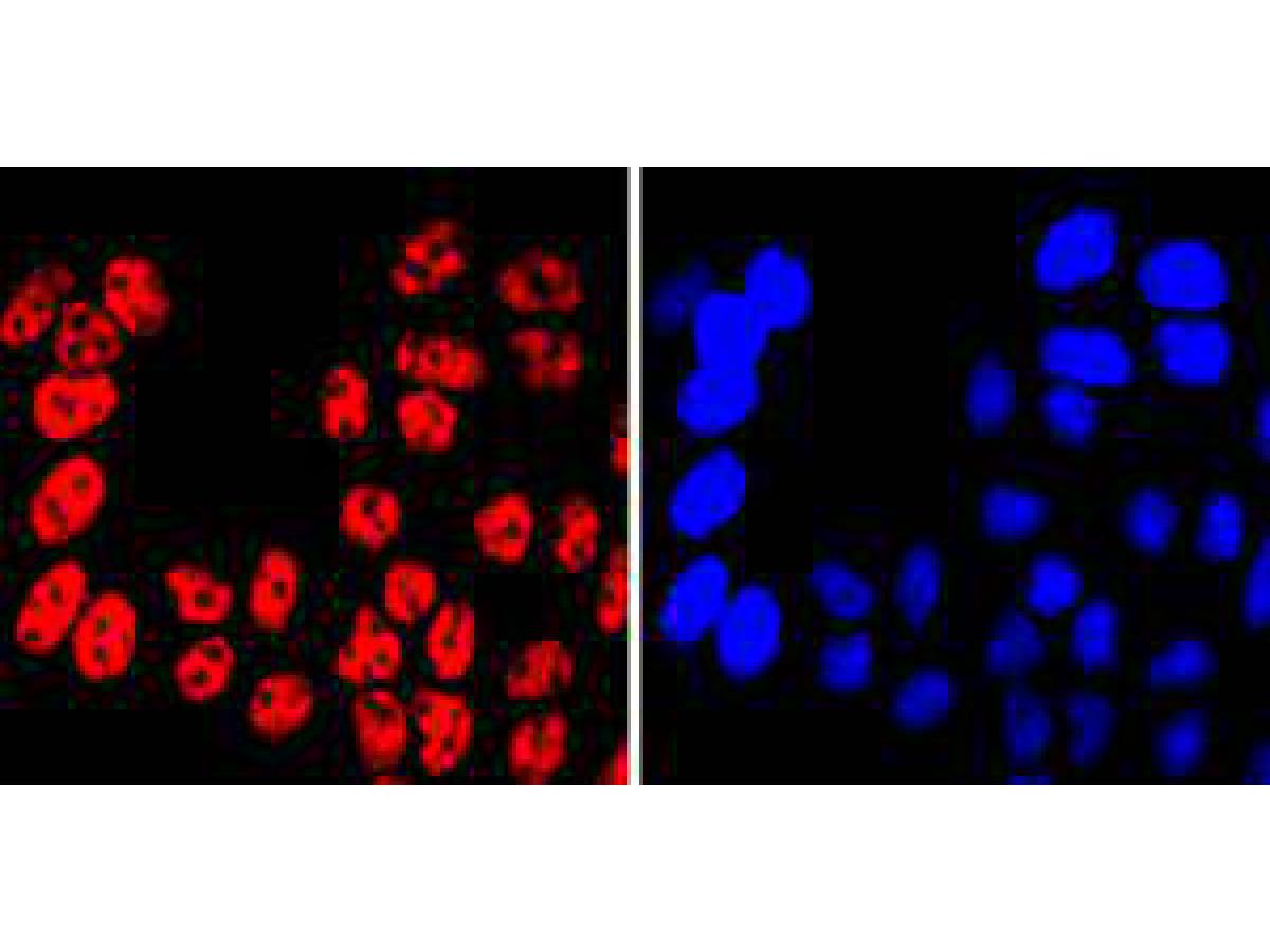 ICC staining of MiTF in Hela cells (red). Formalin fixed cells were permeabilized with 0.1% Triton X-100 in TBS for 10 minutes at room temperature and blocked with 1% Blocker BSA for 15 minutes at room temperature. Cells were probed with the primary antibody (ET1702-86, 1/50) for 1 hour at room temperature, washed with PBS. Alexa Fluor®594 Goat anti-Rabbit IgG was used as the secondary antibody at 1/1,000 dilution. The nuclear counter stain is DAPI (blue).