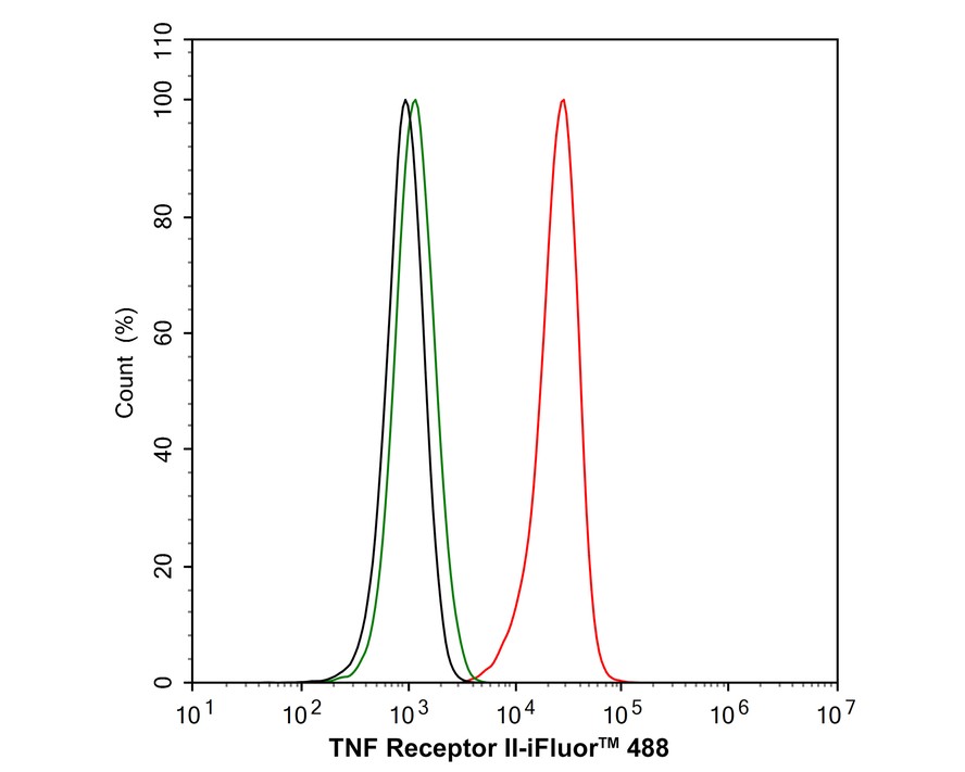 Cells were fixed in 4% paraformaldehyde for 20 minutes at room temperature, permeabilized with 0.1% Triton X-100 in PBS for 5 minutes at room temperature, then blocked with 1% BSA in 10% negative goat serum for 1 hour at room temperature. Cells were then incubated with Rabbit anti-TNF Receptor II antibody (ET1703-63) at 1/100 dilution in 1% BSA in PBST overnight at 4 ℃. Goat Anti-Rabbit IgG H&L (iFluor™ 488, HA1121) was used as the secondary antibody at 1/1,000 dilution. PBS instead of the primary antibody was used as the secondary antibody only control. Nuclear DNA was labelled in blue with DAPI.