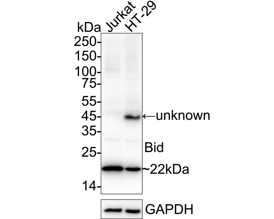 Western blot analysis of Bid on different lysates with Rabbit anti-Bid antibody (ET1703-92) at 1/1,000 dilution.