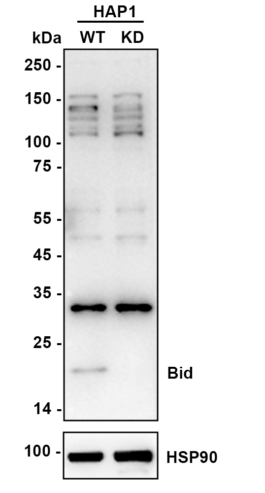 Western blot analysis of Bid on different lysates with Rabbit anti-Bid antibody (ET1703-92) at 1/5,000 dilution.