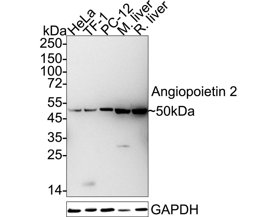Western blot analysis of Angiopoietin 2 on different lysates with Rabbit anti-Angiopoietin 2 antibody (ET1705-6) at 1/10,000 dilution.