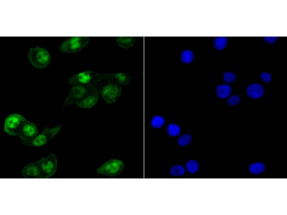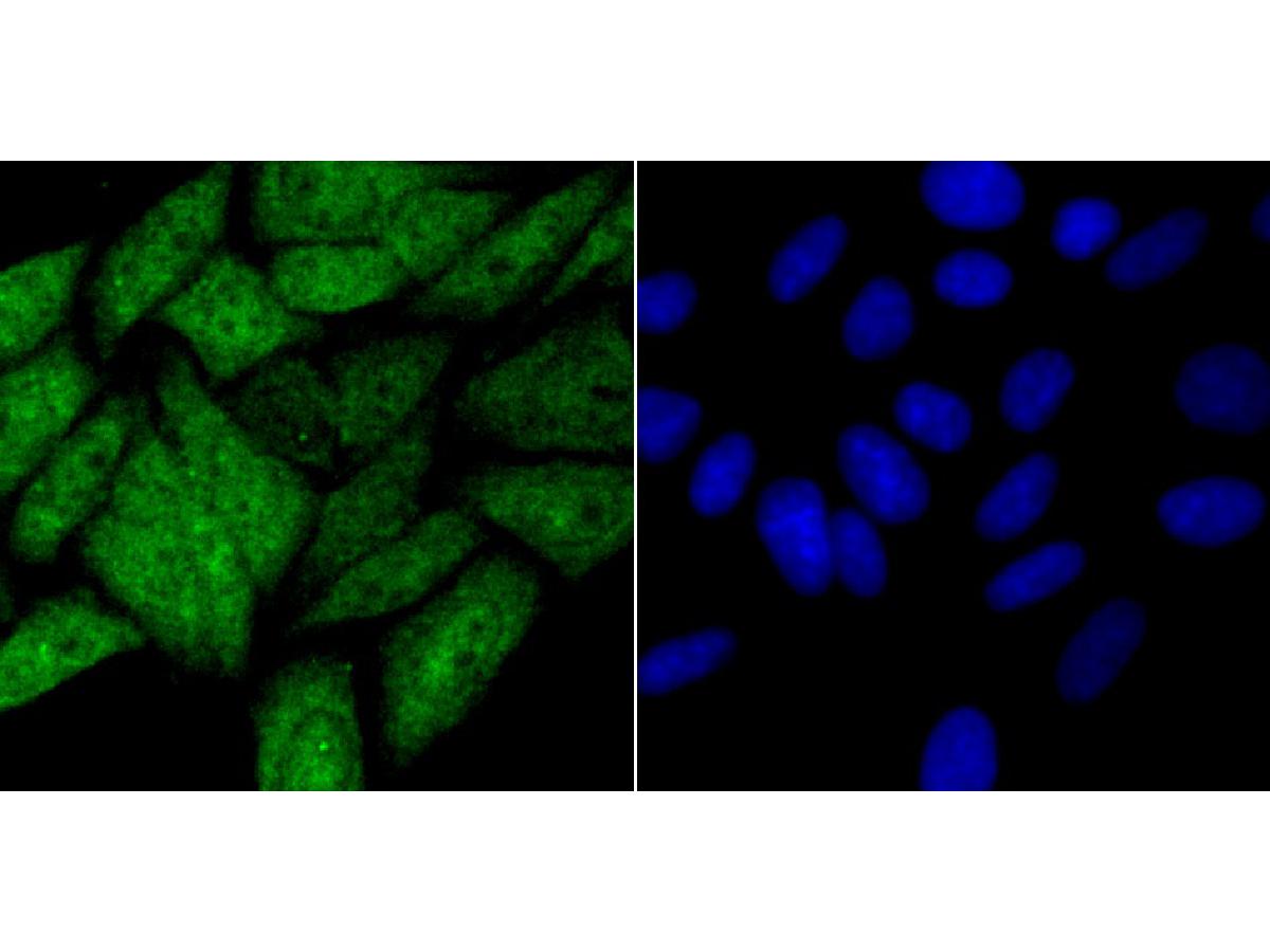 Cells were fixed in 4% paraformaldehyde for 10 minutes at 37 ℃, permeabilized with 0.05% Triton X-100 in PBS for 20 minutes, and then blocked with 2% negative goat serum for 30 minutes at room temperature. Cells were then incubated with Rabbit anti-HIF1AN antibody (ET7108-50) at 1/50 dilution in 2% negative goat serum overnight at 4 ℃. Alexa Fluor®488 conjugate-Goat anti-Rabbit IgG was used as the secondary antibody at 1/1,000 dilution.Nuclear DNA was labelled in blue with DAPI.