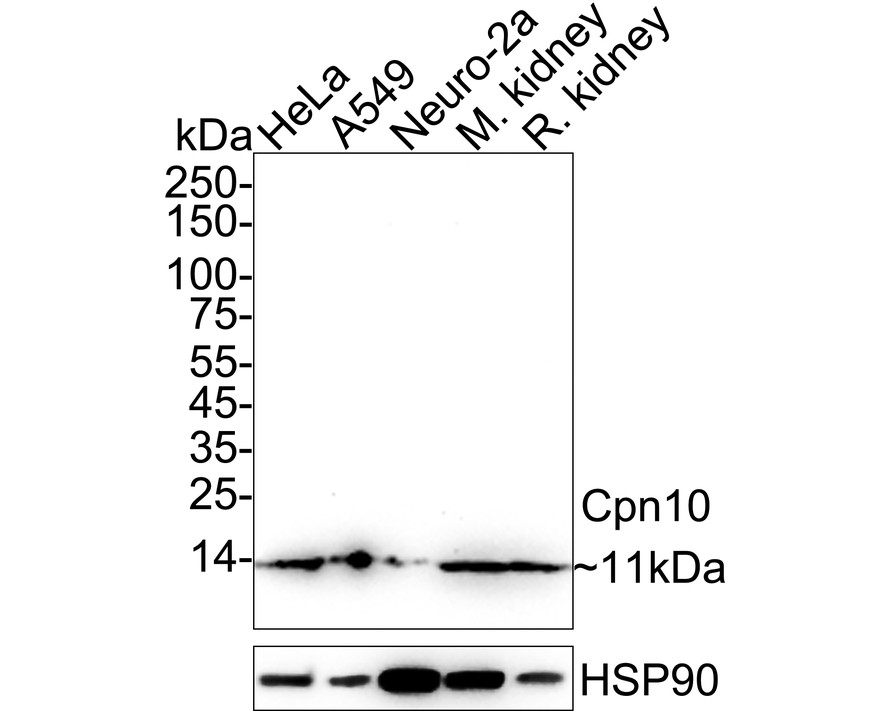 Western blot analysis of Cpn10 on different lysates with Rabbit anti-Cpn10 antibody (ET7108-67) at 1/2,000 dilution.