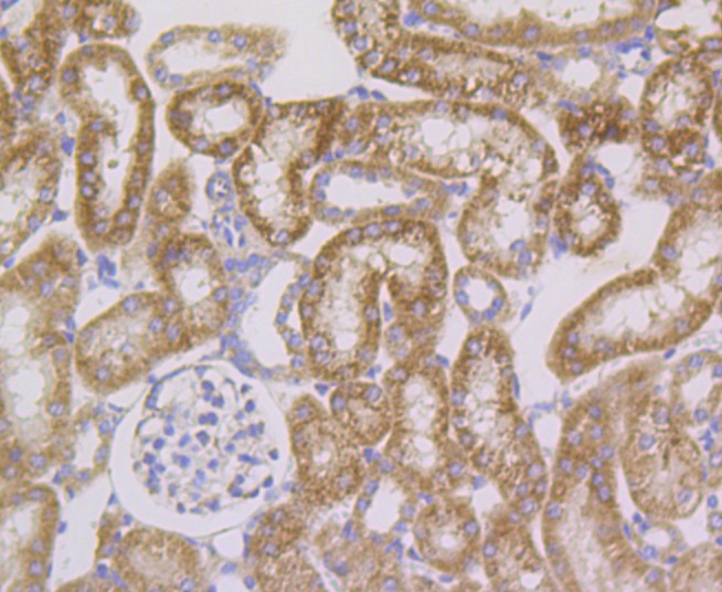 Immunohistochemical analysis of paraffin-embedded mouse kidney tissue using anti-Cpn10 antibody. The section was pre-treated using heat mediated antigen retrieval with Tris-EDTA buffer (pH 8.0-8.4) for 20 minutes.The tissues were blocked in 5% BSA for 30 minutes at room temperature, washed with ddH2O and PBS, and then probed with the primary antibody (ET7108-67, 1/50) for 30 minutes at room temperature. The detection was performed using an HRP conjugated compact polymer system. DAB was used as the chromogen. Tissues were counterstained with hematoxylin and mounted with DPX.