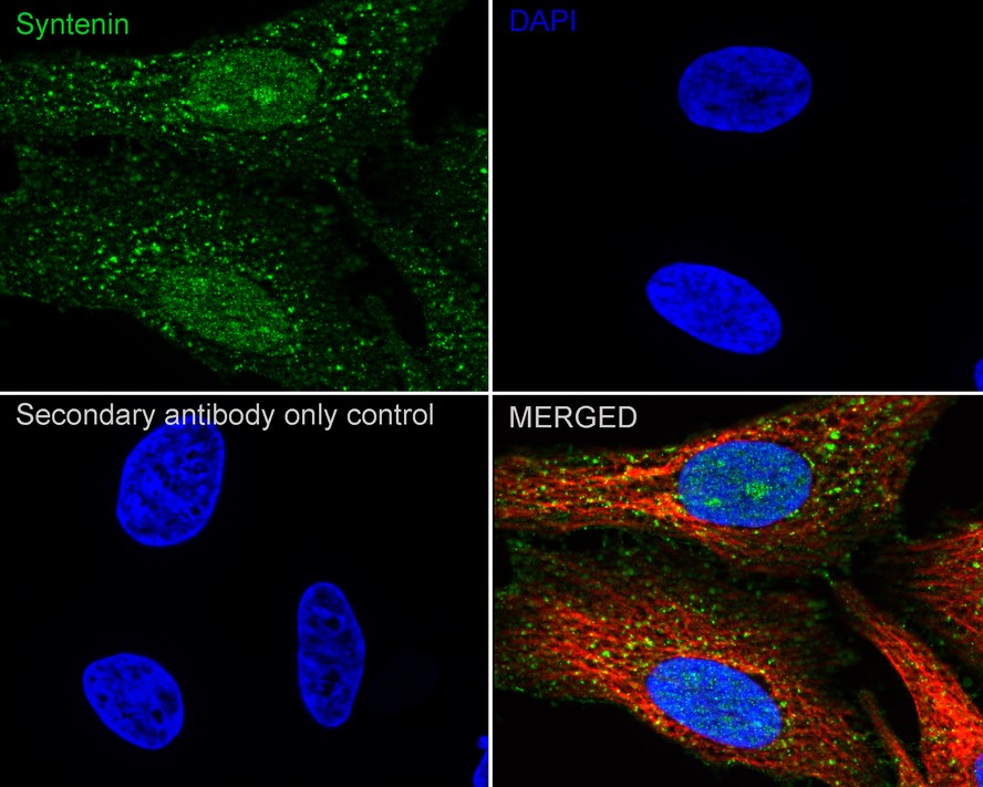 Cells were fixed in 4% paraformaldehyde for 20 minutes at room temperature, permeabilized with 0.1% Triton X-100 in PBS for 5 minutes at room temperature, then blocked with 1% BSA in 10% negative goat serum for 1 hour at room temperature. Cells were then incubated with Rabbit anti-Syntenin antibody (ET7109-14) at 1/100 dilution in 1% BSA in PBST overnight at 4 ℃. Goat Anti-Rabbit IgG H&L (iFluor™ 488, HA1121) was used as the secondary antibody at 1/1,000 dilution. PBS instead of the primary antibody was used as the secondary antibody only control. Nuclear DNA was labelled in blue with DAPI.