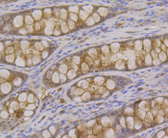 Immunohistochemical analysis of paraffin-embedded human colon tissue using anti-Syntenin antibody. The section was pre-treated using heat mediated antigen retrieval with Tris-EDTA buffer (pH 9.0) for 20 minutes.The tissues were blocked in 1% BSA for 30 minutes at room temperature, washed with ddH2O and PBS, and then probed with the primary antibody (ET7109-14, 1/50) for 30 minutes at room temperature. The detection was performed using an HRP conjugated compact polymer system. DAB was used as the chromogen. Tissues were counterstained with hematoxylin and mounted with DPX.