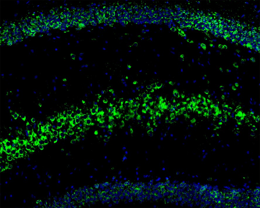Immunofluorescence analysis of frozen mouse hippocampus tissue labeling GSK3 beta with Rabbit anti-GSK3 beta antibody (HA750131).