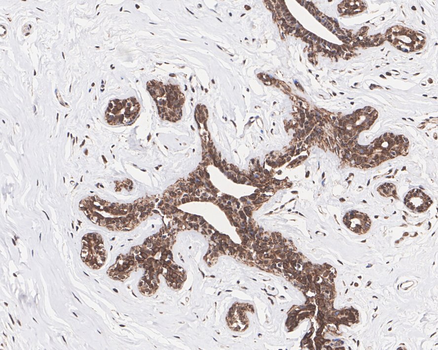 Immunohistochemical analysis of paraffin-embedded human breast tissue with Rabbit anti-GSK3 beta antibody (HA750131) at 1/200 dilution.