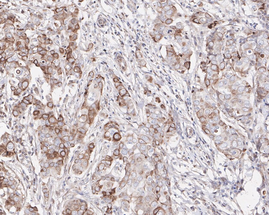 Immunohistochemical analysis of paraffin-embedded human breast carcinoma tissue with Rabbit anti-GSK3 beta antibody (HA750131) at 1/200 dilution.