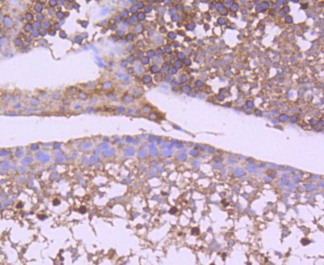 Immunohistochemical analysis of paraffin-embedded mouse testis tissue using anti-GSK3 beta antibody. The section was pre-treated using heat mediated antigen retrieval with Tris-EDTA buffer (pH 8.0-8.4) for 20 minutes.The tissues were blocked in 5% BSA for 30 minutes at room temperature, washed with ddH2O and PBS, and then probed with the primary antibody (HA750131, 1/50) for 30 minutes at room temperature. The detection was performed using an HRP conjugated compact polymer system. DAB was used as the chromogen. Tissues were counterstained with hematoxylin and mounted with DPX.