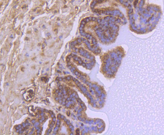 The section was pre-treated using heat mediated antigen retrieval with Tris-EDTA buffer (pH 9.0) for 20 minutes. The tissues were blocked in 1% BSA for 20 minutes at room temperature, washed with ddH2O and PBS, and then probed with the primary antibody (HA750131) at 1/1,000 dilution for 1 hour at room temperature. The detection was performed using an HRP conjugated compact polymer system. DAB was used as the chromogen. Tissues were counterstained with hematoxylin and mounted with DPX. -
