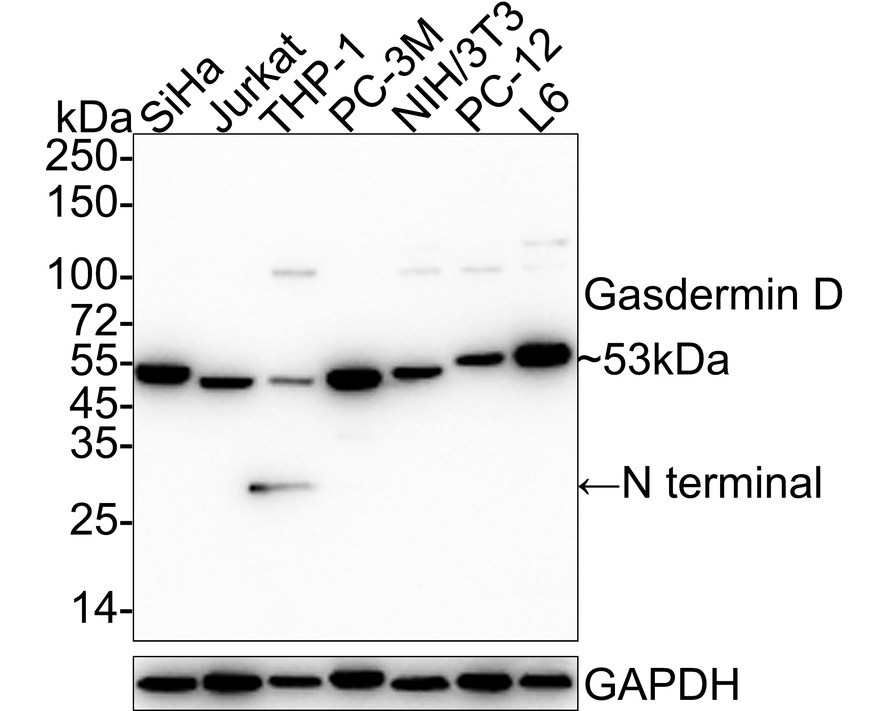 Western blot analysis of Gasdermin D (N terminal) on different lysates with Rabbit anti-Gasdermin D (N terminal) antibody (HA721144) at 1/2,000 dilution.