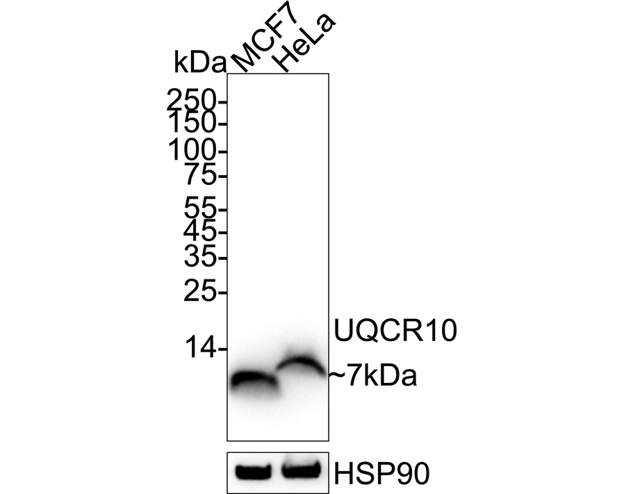 Western blot analysis of Cytochrome b-c1 complex subunit 9/UQCR10 on different lysates with Rabbit anti-Cytochrome b-c1 complex subunit 9/UQCR10 antibody (HA500222) at 1/5,000 dilution.