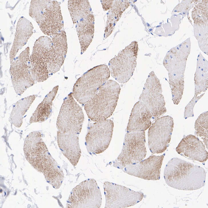 Immunohistochemical analysis of paraffin-embedded human skeletal muscle tissue with Rabbit anti-Cytochrome b-c1 complex subunit 9/UQCR10 antibody (HA500222) at 1/1,000 dilution.