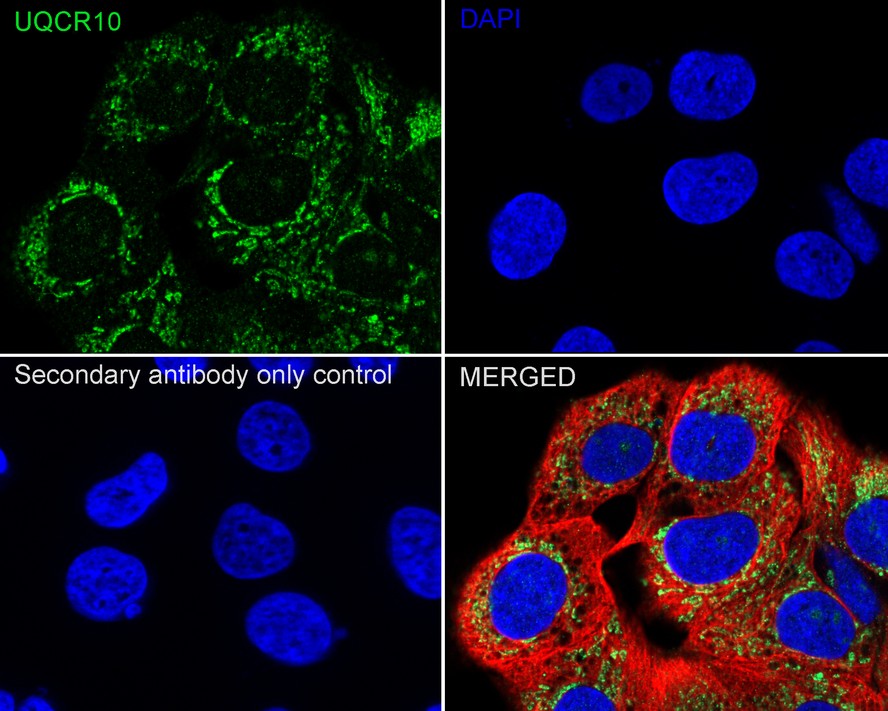 Cells were fixed in 4% paraformaldehyde for 15 minutes at room temperature, permeabilized with 0.1% Triton X-100 in PBS for 15 minutes at room temperature, then blocked with 1% BSA in 10% negative goat serum for 1 hour at room temperature. Cells were then incubated with Rabbit anti-Cytochrome b-c1 complex subunit 9/UQCR10 antibody (HA500222) at 1/250 dilution in 1% BSA in PBST overnight at 4 ℃. Goat Anti-Rabbit IgG H&L (iFluor™ 488, HA1121) was used as the secondary antibody at 1/1,000 dilution. PBS instead of the primary antibody was used as the secondary antibody only control. Nuclear DNA was labelled in blue with DAPI.