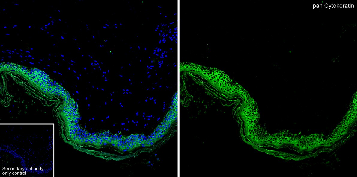 Cells were fixed in 4% paraformaldehyde for 30 minutes, permeabilized with 0.1% Triton X-100 in PBS for 15 minutes, and then blocked with 2% BSA for 30 minutes at room temperature. Cells were then incubated with Mouse anti-pan Cytokeratin antibody (HA601094) at 1/50 dilution in 2% BSA overnight at 4 ℃. Goat Anti-Mouse IgG H&L (iFluor™ 488, HA1125) was used as the secondary antibody at 1/1,000 dilution. PBS instead of the primary antibody was used as the secondary antibody only control. Nuclear DNA was labelled in blue with DAPI.