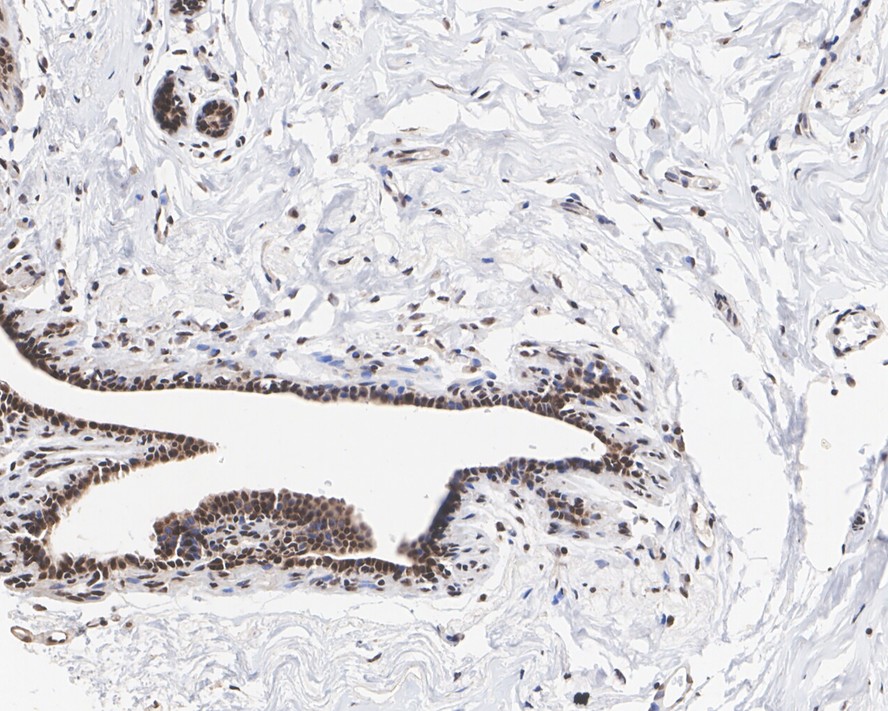 Immunohistochemical analysis of paraffin-embedded human breast tissue with Mouse anti-BRCA1 antibody (HA601304) at 1/2,000 dilution.