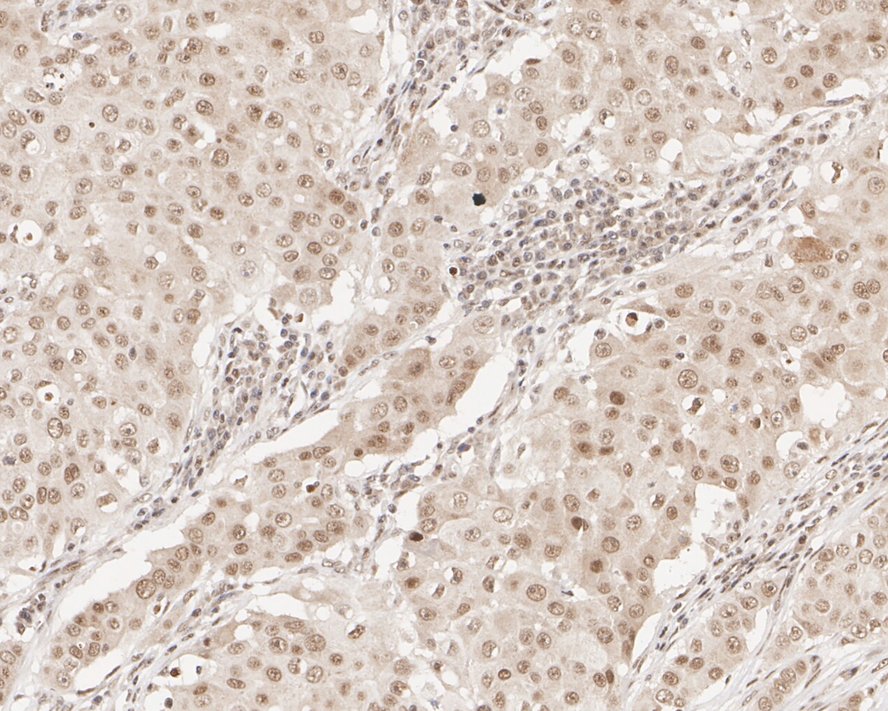 Immunohistochemical analysis of paraffin-embedded human breast cancer tissue with Mouse anti-BRCA1 antibody (HA601304) at 1/1,000 dilution.