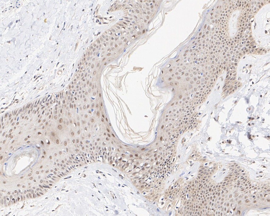 Immunohistochemical analysis of paraffin-embedded human skin tissue with Mouse anti-BRCA1 antibody (HA601304) at 1/1,000 dilution.