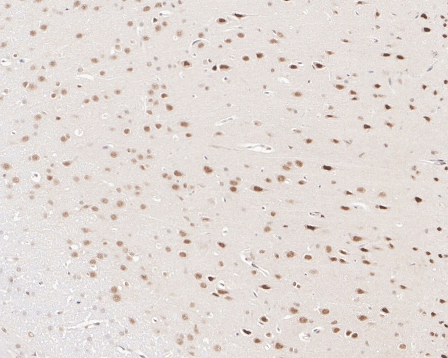 Immunohistochemical analysis of paraffin-embedded rat brian tissue with Mouse anti-BRCA1 antibody (HA601304) at 1/5,000 dilution.