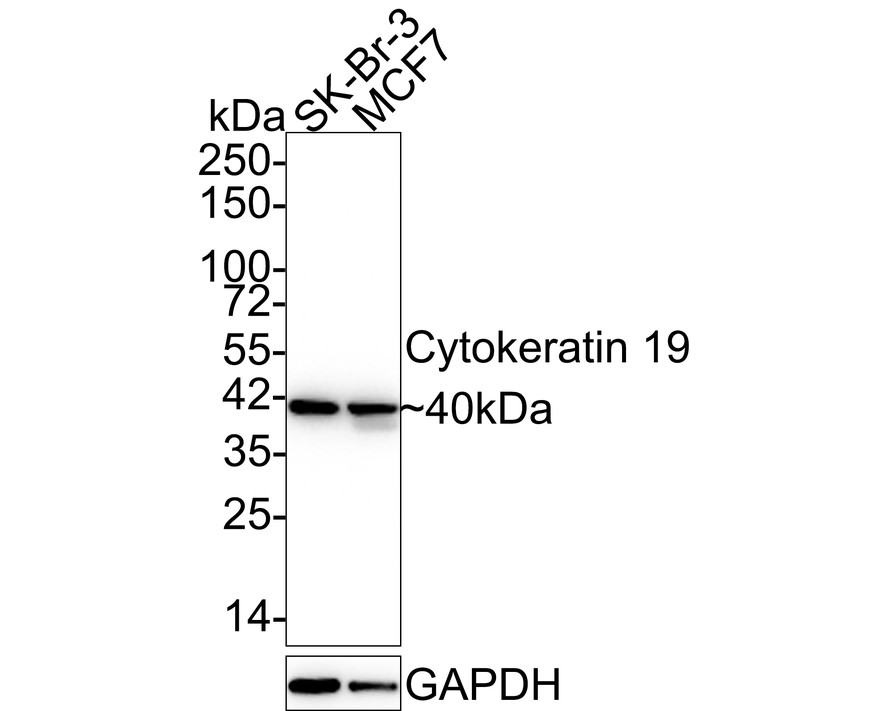 Western blot analysis of Cytokeratin 19 on different lysates with Mouse anti-Cytokeratin 19 antibody (HA610133) at 1/1,000 dilution.