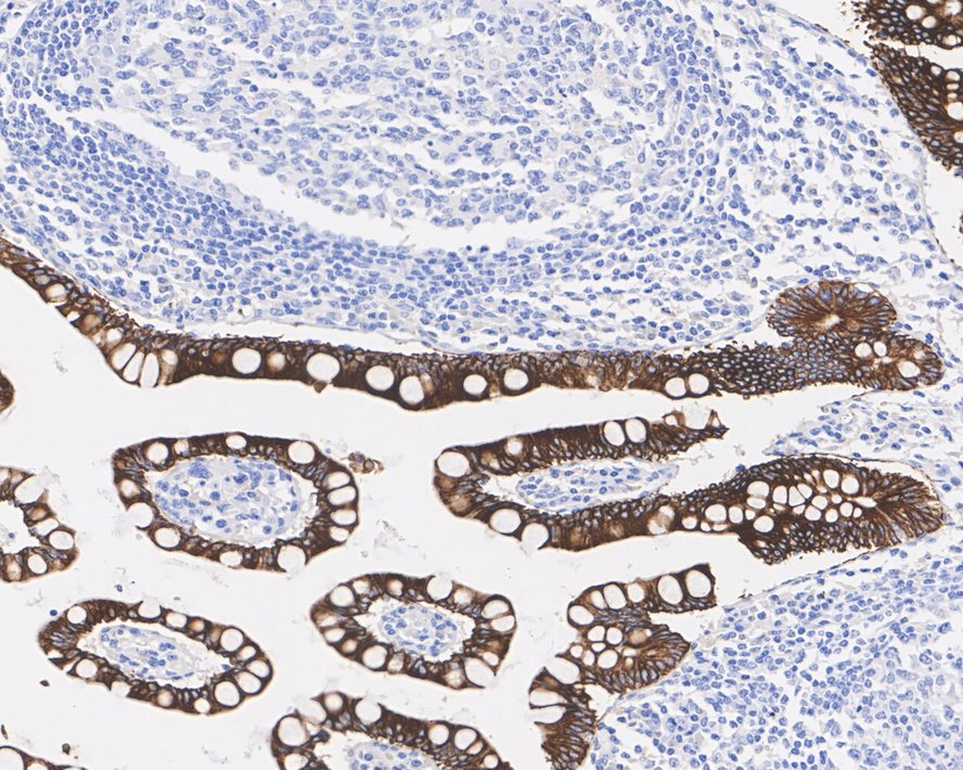Immunohistochemical analysis of paraffin-embedded human small intestine tissue with Mouse anti-Cytokeratin 19 antibody (HA610133) at 1/1,000 dilution.