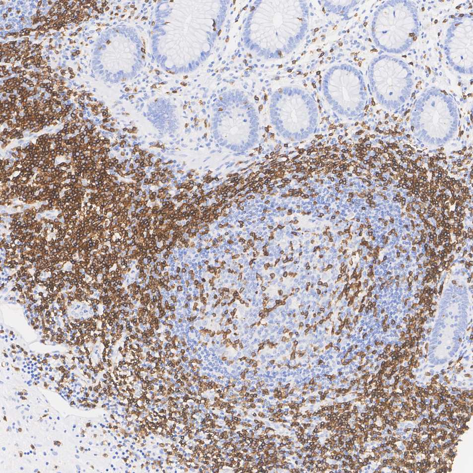 The CD3 protein is a T-cell marker, a complex of four structurally distinct membrane glycoprotein isoforms, 20-50 kDa, comprising extracellular, transmembrane and intracellular domains. The CD3 complex is responsible for mediating signal transduction to the internal environment upon antigenic recognition by TCR, causing T-cell proliferation and release of cytokines. Except for a weak expression in Purkinje cells (with some of the Abs) and activated NK-cells, CD3 is found only in T-cells. CD3 appear in the cytoplasm of prothymocytes, and on the surface of about 95% of thymocytes, while cytoplasmic CD3 is lost as the cells differentiate into medullary thymocytes. In therapy resistant celiac disease, a shift from membranous to cytoplasmic CD3 expression is seen (together with loss of CD8). In malignant lymphomas, CD3 is a pan-T-cell lineage-restricted antigen, detected in 80-97% of the T-cell lymphomas. Mature T-cell lymphomas including cases of mycosis fungoides, peripheral T-cell lymphoma and anaplastic large cell lymphoma may aberrantly lose CD3. NK-cell lymphomas can show a cytoplasmic reaction. Reed-Sternberg cells may show a globular paranuclear reaction. CD3 is an important marker in the classification of malignant lymphomas and lymphoid leukaemias. Also the marker is useful for the identification of T-cells in, e.g., celiac disease, lymphocytic colitis and colorectal carcinomas associated with loss of a mismatch repair protein.