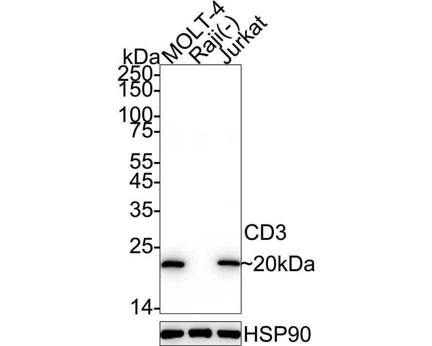 CD3 was immunoprecipitated from 1mg/ml Jurkat whole cell lysate with HA720082 at 2ug/ml dilution. Western blot was performed from the immunoprecipitate using HA720082 at 1ug/ml dilution. Goat anti-Rabbit IgG-HRP antibody (HA1001) was used as the secondary antibody at 1/300,000 dilution.