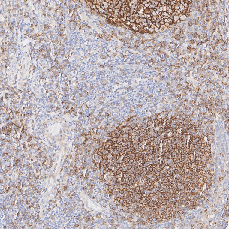 Immunohistochemical analysis of paraffin-embedded human spleen tissue with Rabbit anti-CD21 antibody (HA721163) at 1/4,000 dilution.