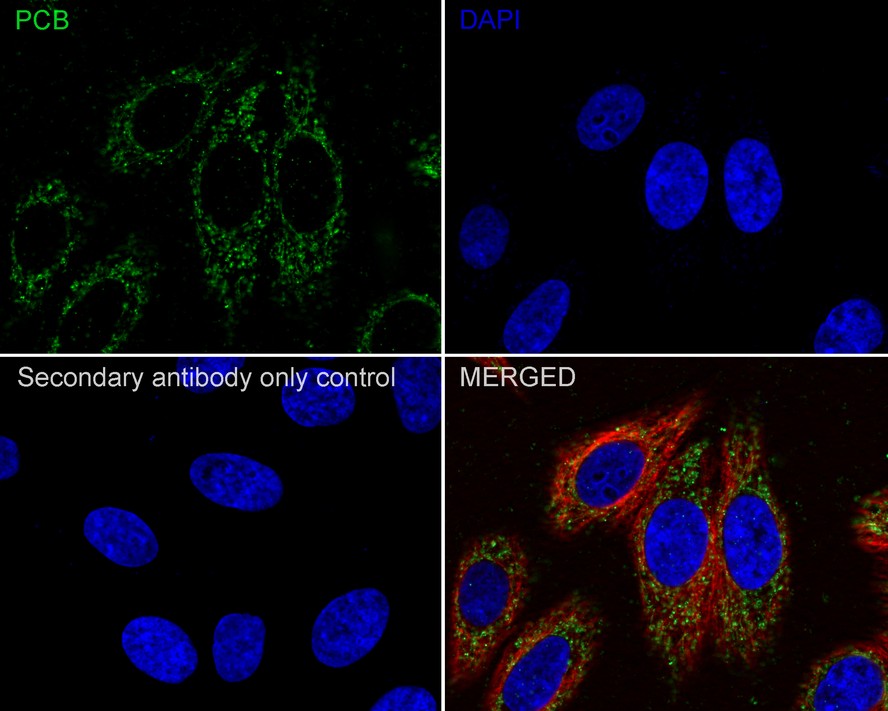 Cells were fixed in 4% paraformaldehyde for 20 minutes at room temperature, permeabilized with 0.1% Triton X-100 in PBS for 5 minutes at room temperature, then blocked with 1% BSA in 10% negative goat serum for 1 hour at room temperature. Cells were then incubated with Rabbit anti-PCB antibody (HA721698) at 1/100 dilution in 1% BSA in PBST overnight at 4 ℃. Goat Anti-Rabbit IgG H&L (iFluor™ 488, HA1121) was used as the secondary antibody at 1/1,000 dilution. PBS instead of the primary antibody was used as the secondary antibody only control. Nuclear DNA was labelled in blue with DAPI.