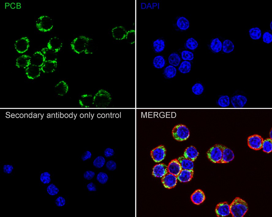 Cells were fixed in 4% paraformaldehyde for 20 minutes at room temperature, permeabilized with 0.1% Triton X-100 in PBS for 5 minutes at room temperature, then blocked with 1% BSA in 10% negative goat serum for 1 hour at room temperature. Cells were then incubated with Rabbit anti-PCB antibody (HA721698) at 1/250 dilution in 1% BSA in PBST overnight at 4 ℃. Goat Anti-Rabbit IgG H&L (iFluor™ 488, HA1121) was used as the secondary antibody at 1/1,000 dilution. PBS instead of the primary antibody was used as the secondary antibody only control. Nuclear DNA was labelled in blue with DAPI.