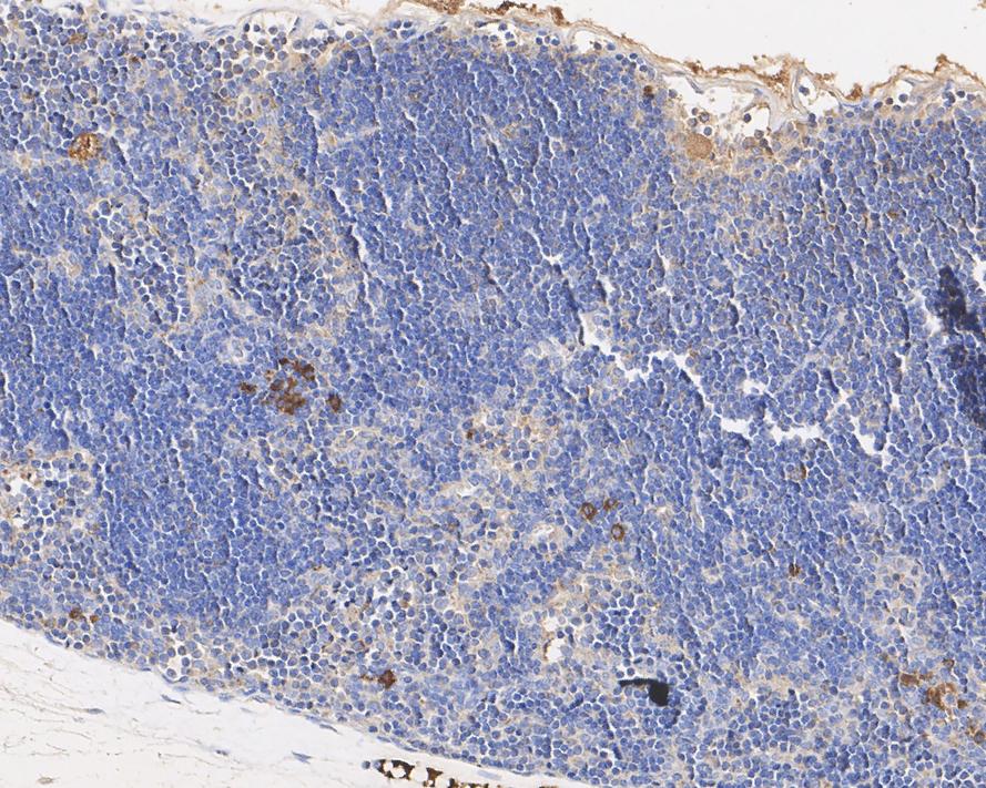 Immunohistochemical analysis of paraffin-embedded mouse lymph node tissue with Rabbit anti-PCB antibody (HA721698) at 1/200 dilution.
