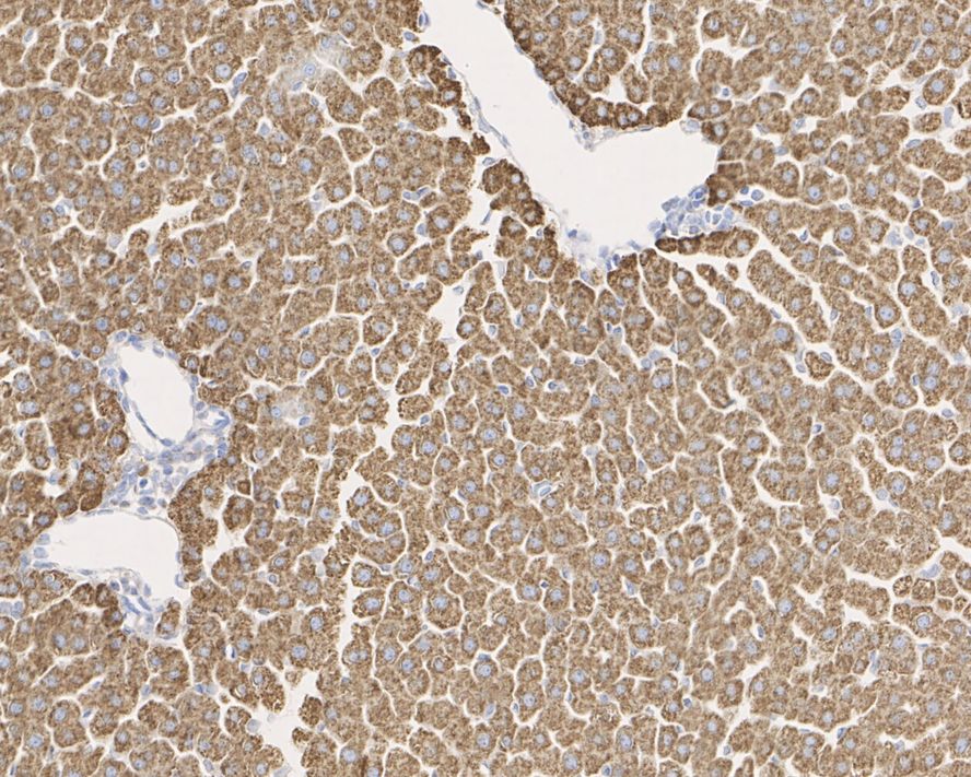 Immunohistochemical analysis of paraffin-embedded mouse liver tissue with Rabbit anti-PCB antibody (HA721698) at 1/200 dilution.