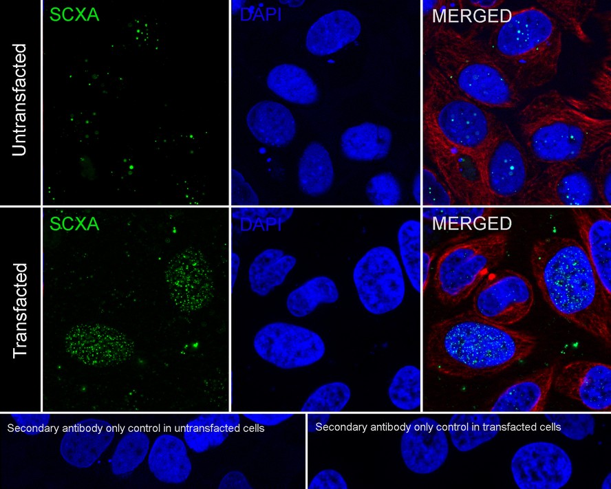 Immunocytochemistry analysis of HeLa transfected with or without SCXA cells labeling SCXA with Rabbit anti-SCXA antibody (HA721805) at 1/100 dilution.